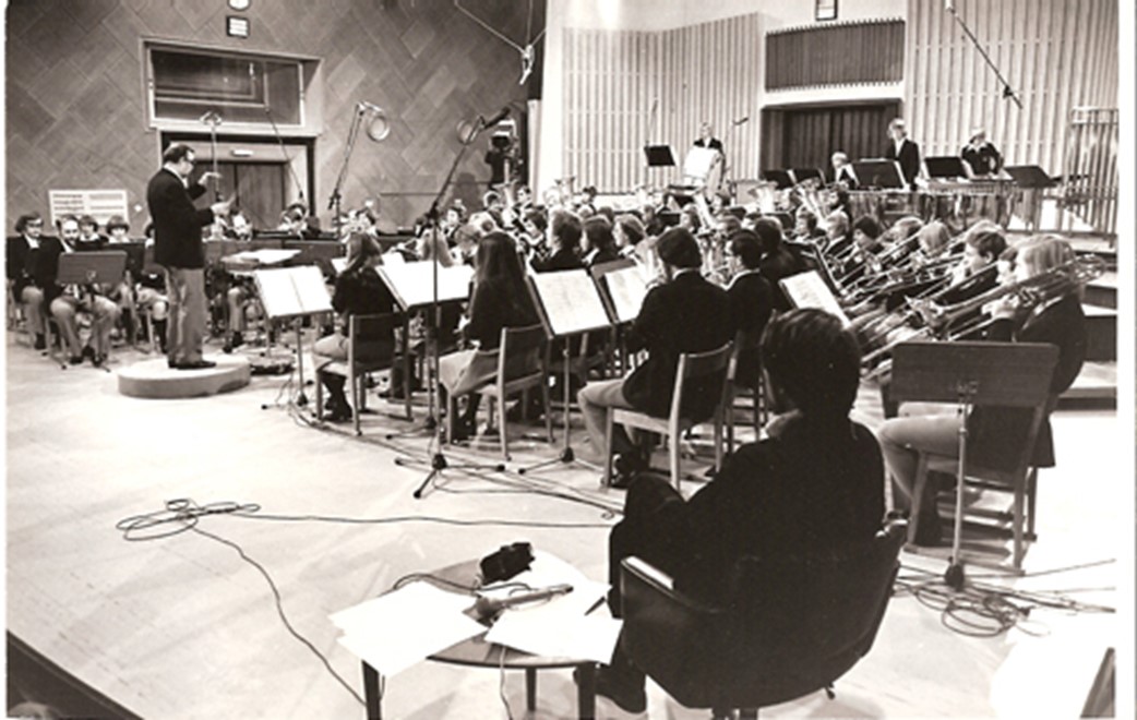 Ungdomskorps 1975 - finale i NRK-konkurransen i Store Studio. Dirigent er Tom